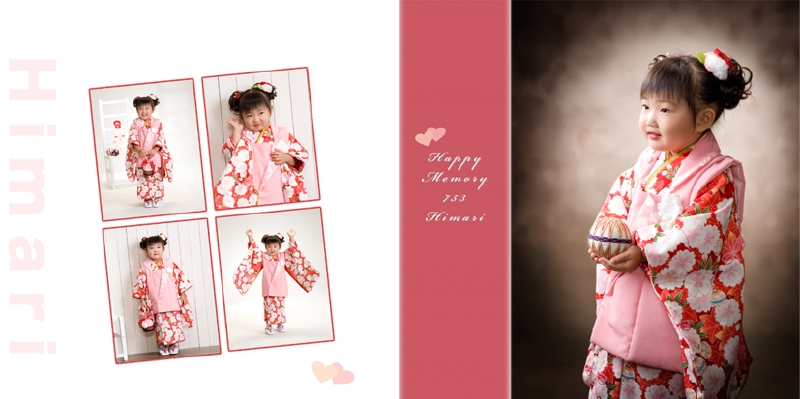 | 毎年、着物、ドレスを入荷しています。みるだけでもOKです!ブランド衣装もご用意しております。当館の写真パックは、お出かけ衣装レンタル&着付け&ヘアメイク&本人の撮影料込みで22,000円〜ご用意しています。詳しくは料金表をご確認下さい。 | 七五三デザイン写真集大人気の写真集コースです。多ポーズ撮影した中から写真をセレクトしお着物の色などに合わせてかわいくデザインいたします。写真集は平日撮り、前撮りのみとさせていただきます。詳しくはお問い合わせ下さい。 |