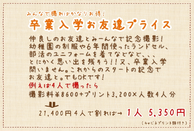 ご入学おめでとうございます。これから始まる冒険への第一歩。元気いっぱいの晴れ姿をお写真に残しませんか?みなさんは入学の時覚えていますか?この子達はこの写真が一生の宝物になるはず!宝物をいっぱい残しましょう!!